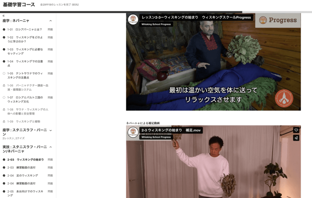 本場ロシア、バルト三国のウィスキング文化から、ウィスキングの基礎、安全管理、ウィスクと植物など、幅広いテーマのオンライン講座で視聴可能です。実技パートでは、ロシアのウィスキングマスターが、それぞれの動きの意味や考え方を説明する特別な動画を、日本語の字幕付きで見ることができます。ネバーニャによる補足動画もついており、細かなニュアンスを確認することができます。